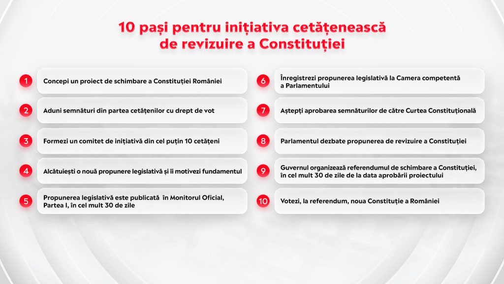 La ȘTIU PE CE LUME TRĂIESC, ți-am prezentat 10 pași prin care poți să schimbi Constituția, astfel încât să ai posibilitatea de a cere oricând referendum decizional pentru a propune, aproba și respinge legi ale Parlamentului sau decizii ale Președinției și Guvernului.
