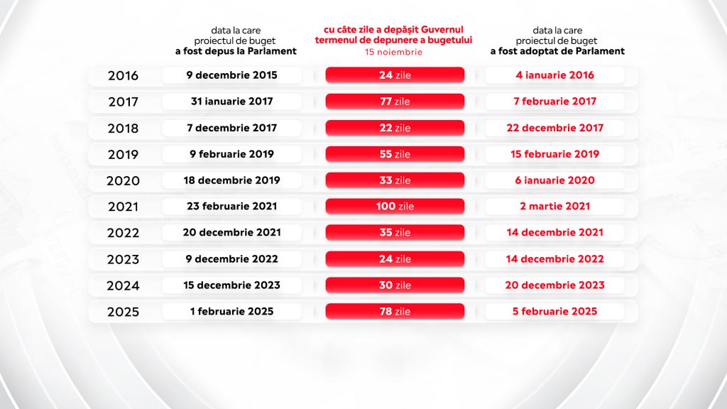 Deși aveau obligația legală de a depune bugetul la Parlament până la data de 15 noiembrie, niciunul dintre Guvernele ultimilor 10 ani NU a respectat termenul.
